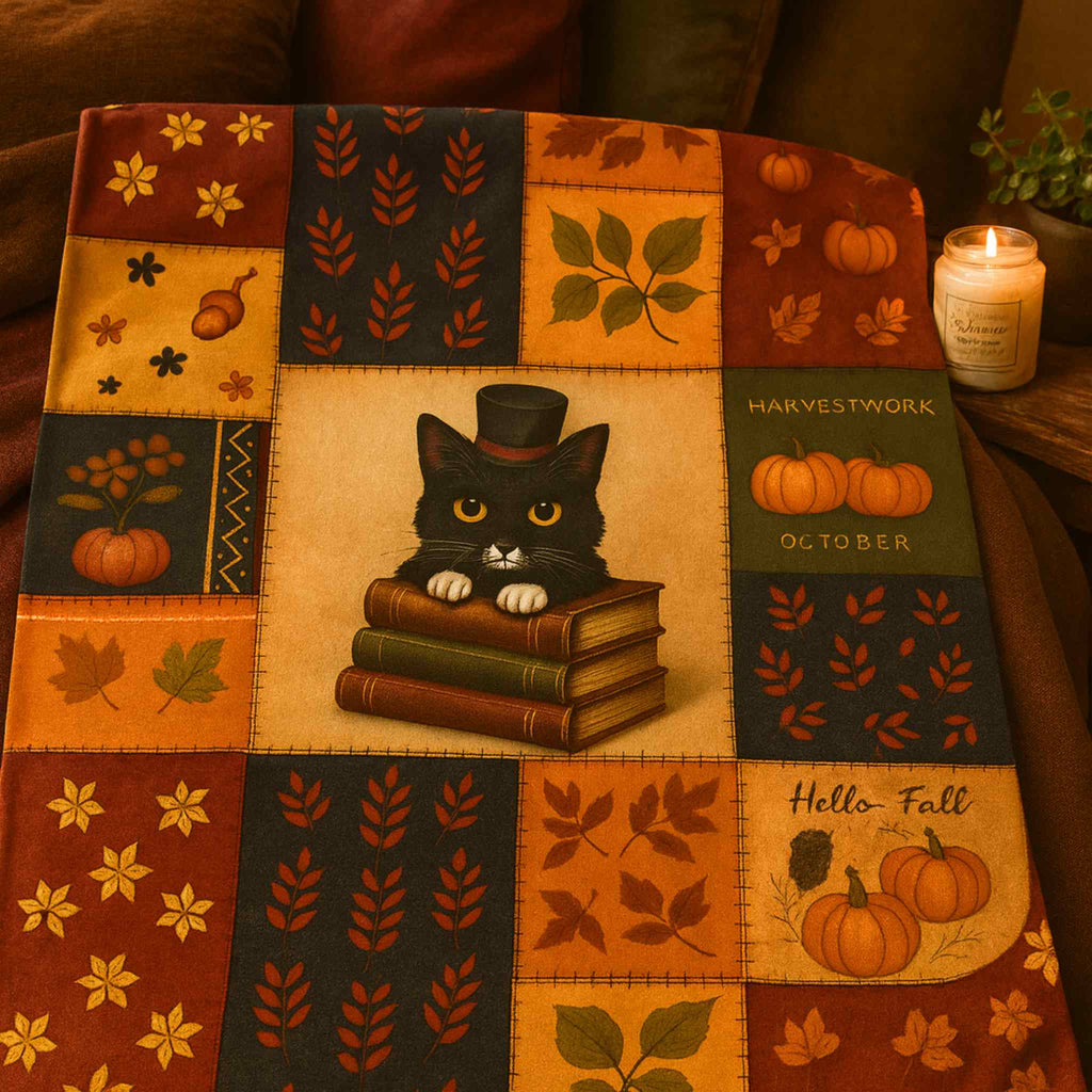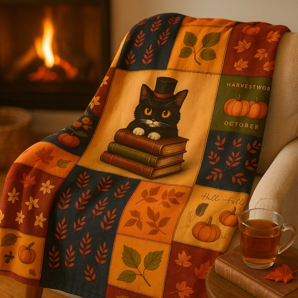 The Inkwhisker Blanket is an autumn cat throw blanket available in 50x60 or 60x80 sizes, crafted in soft velveteen for cozy fall home decor. A curious black cat peeks from a tower of books, framed by pumpkins, leaves, and stitched autumn squares that feel plucked from a vintage storybook. Perfect for cozy reading corners, seasonal displays, or as a thoughtful gift for book lovers and cat enthusiasts. Order now to wrap your home in warmth, comfort, and literary autumn charm.