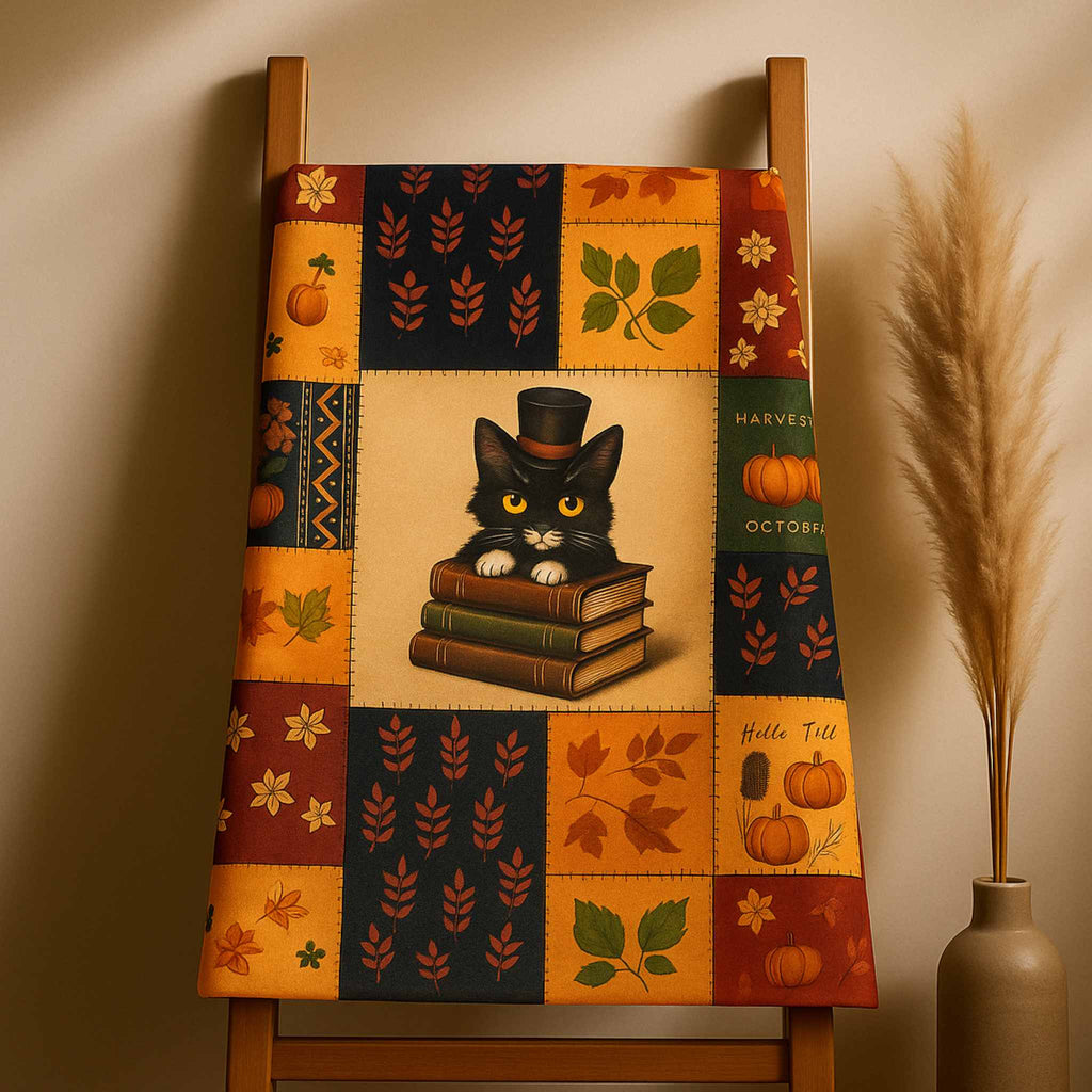 The mix of pumpkins, leaves, and folk-art panels makes this throw feel like a quilted heirloom. At its center, the dapper cat in a top hat adds a hint of gothic wit, while the surrounding patchwork grounds it in seasonal coziness.