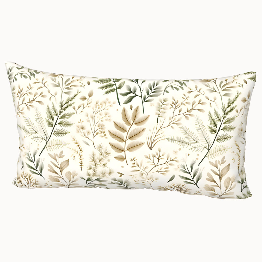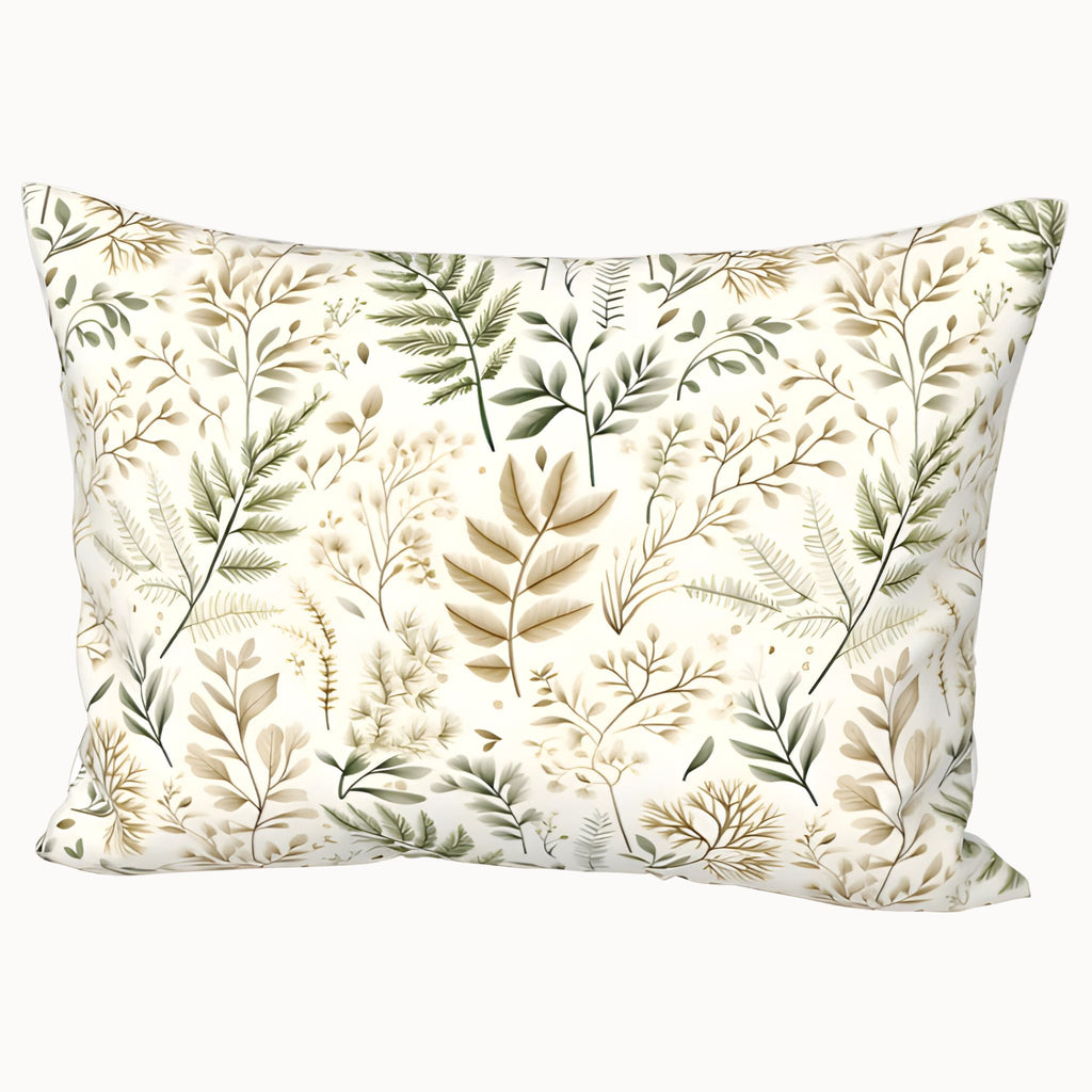 Botanical cotton sateen pillow shams that bring soft green ferns and warm neutrals into your space. The Fernlight shams offer smooth, breathable comfort with a gentle sateen sheen that brightens your bedding and adds peaceful, nature-rooted charm. Each sham features muted greenery and golden stems printed with eco-friendly inks for lasting clarity. Available in Standard or King, these shams pair seamlessly with warm wood tones, beige throws, and relaxed cottage interiors. Order now to create a soothing, grounded bedroom retreat tonight.