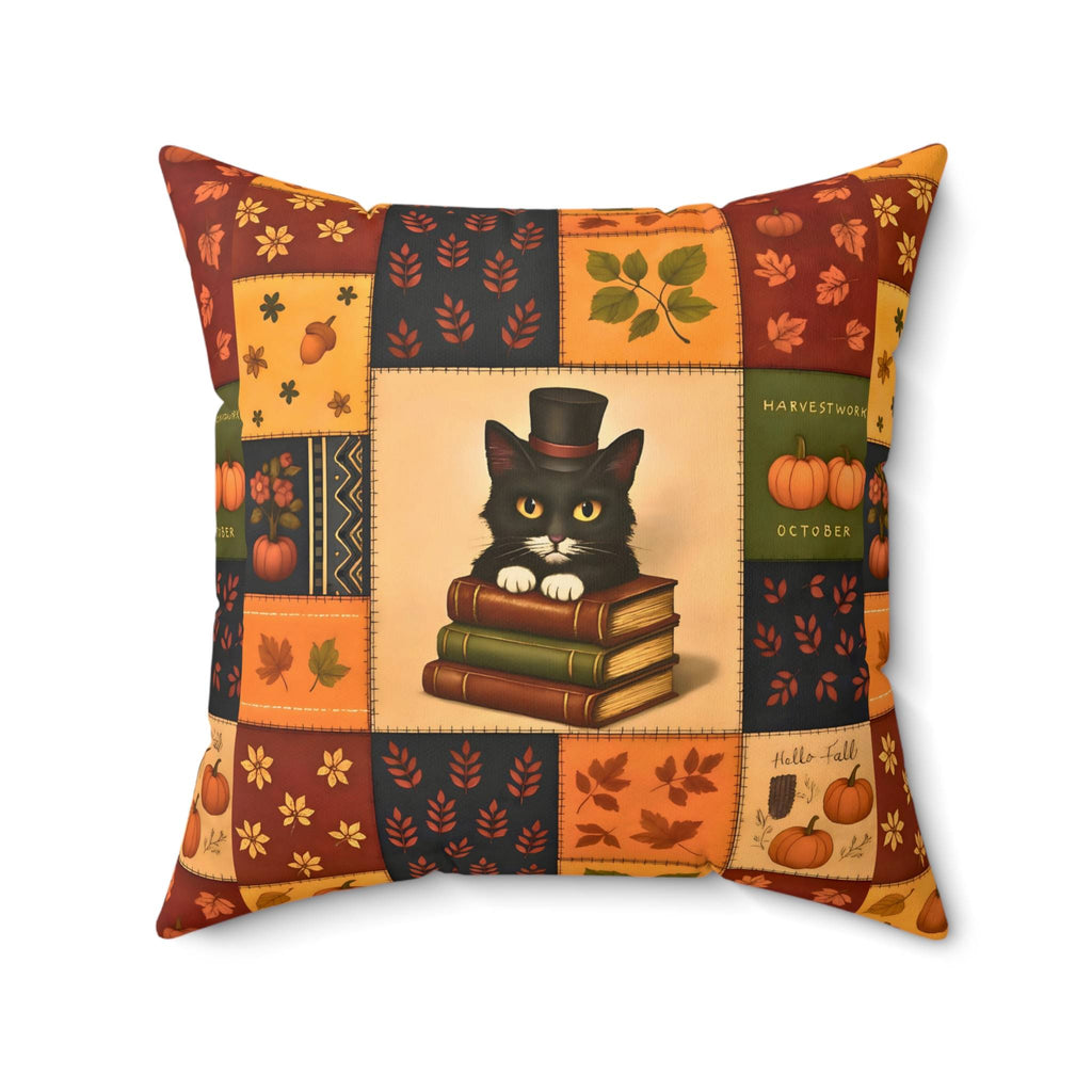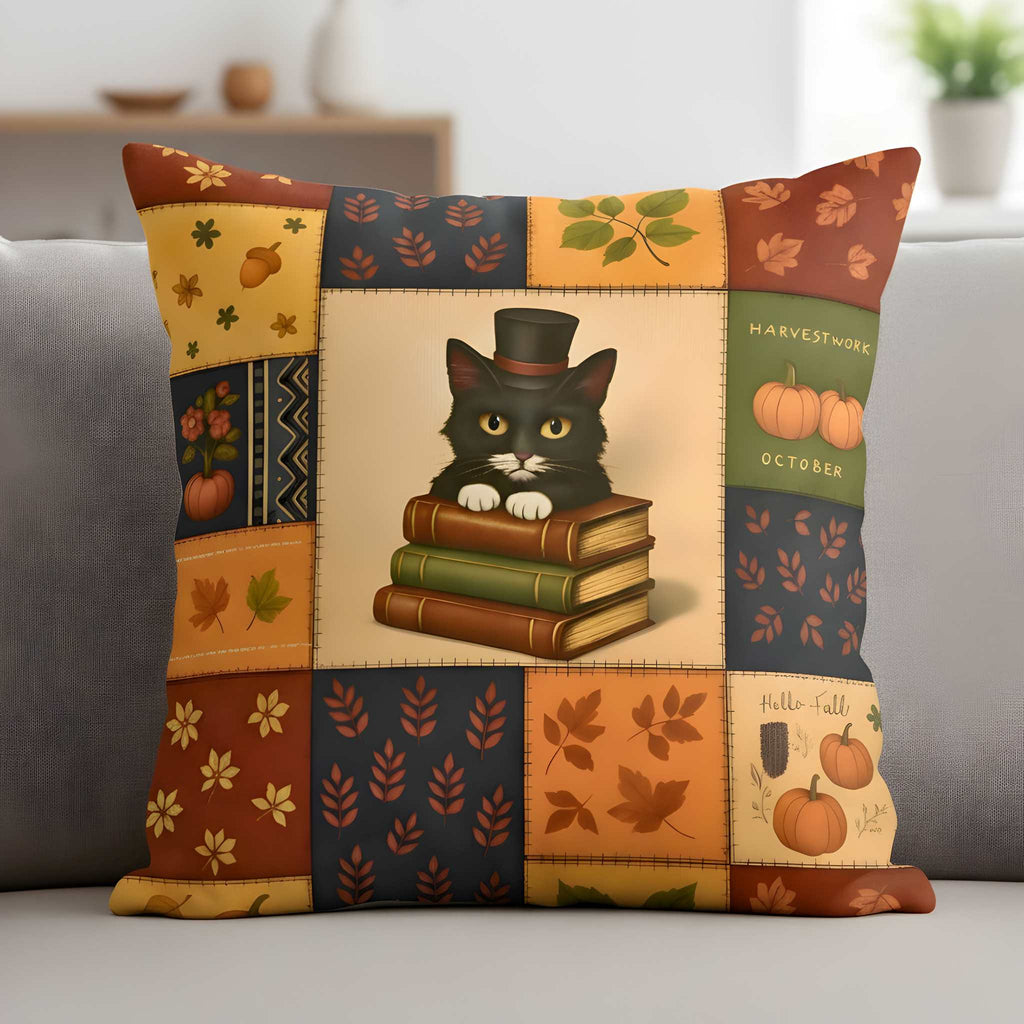 A dapper black cat in a top hat perches atop a stack of books, framed by a quilt-like border of pumpkins, leaves, and rustic stitching. The Inkwhisker Pillow captures the warmth of autumn storytelling with a touch of whimsy, making it a charming accent for reading chairs, seasonal living rooms, or cozy guest beds. Crafted in faux suede with a velvety finish, it’s available in 16", 18", and 20" sizes with a hidden zipper and optional cushion insert. Order today to invite bookish charm and seasonal coziness into your home.