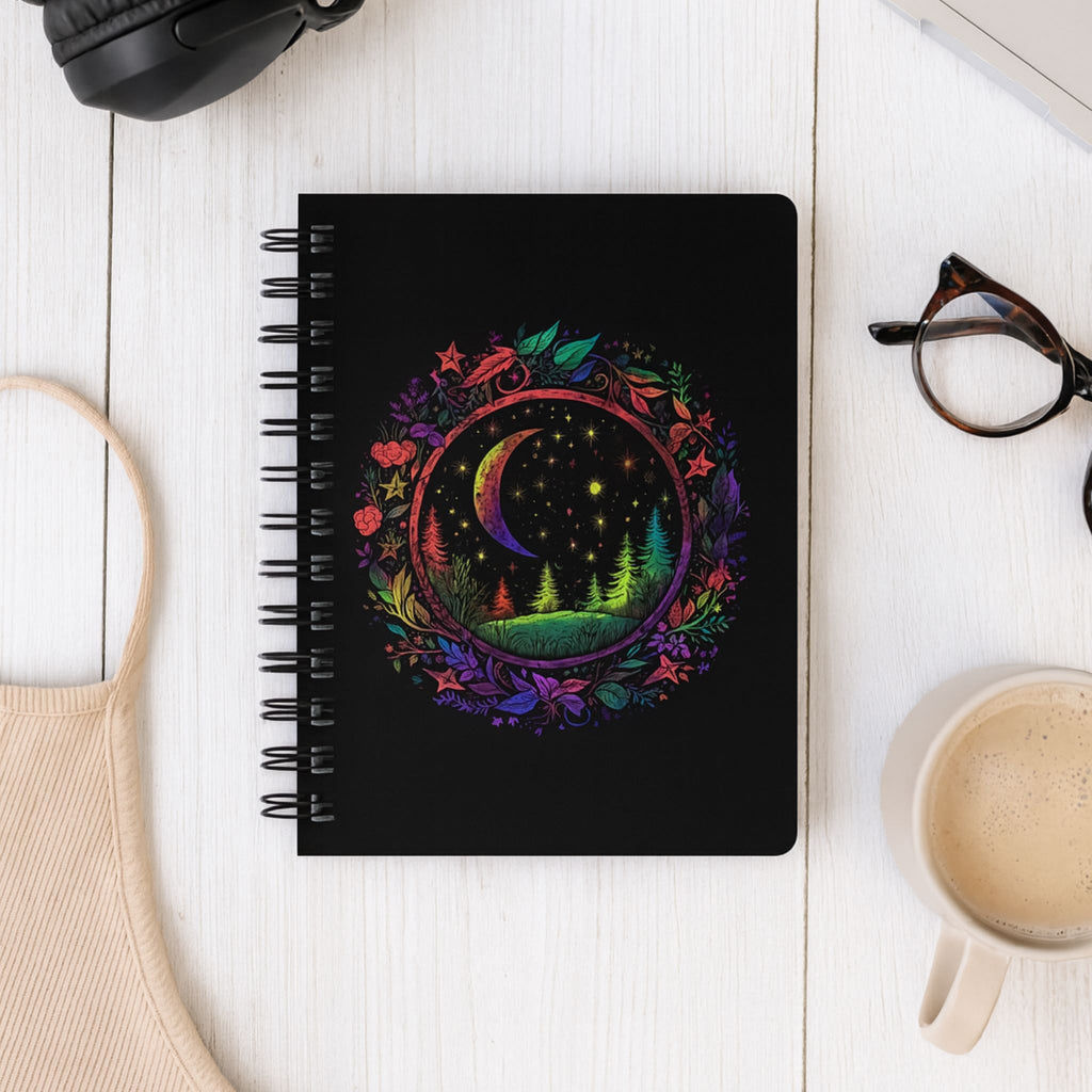 Let your words wander beneath rainbow canopies and star-dusted skies. The vivid neon artwork on the front cover features a moonlit forest scene wrapped in celestial blooms, whimsical yet deeply rooted in gothic allure. The matte black back cover adds contrast and balance, creating a notebook that feels like a tiny gateway to your inner world.