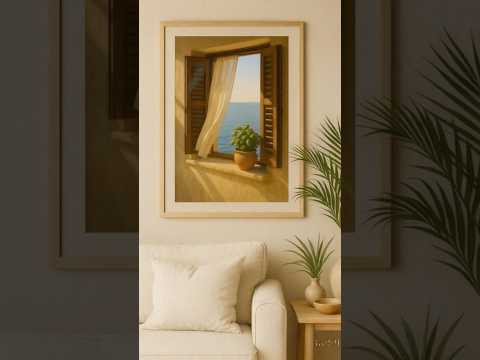A breeze stirs the linen curtain, lifting it gently as sunlight spills through green shutters. Just beyond the windowsill, the basil glows in a terracotta pot—lush, fragrant, alive. The sea glimmers in soft ripples, its quiet rhythm echoing through a space untouched by hurry. This coastal window wall art invites you to buy into a slower moment, a pause carved out just for you.