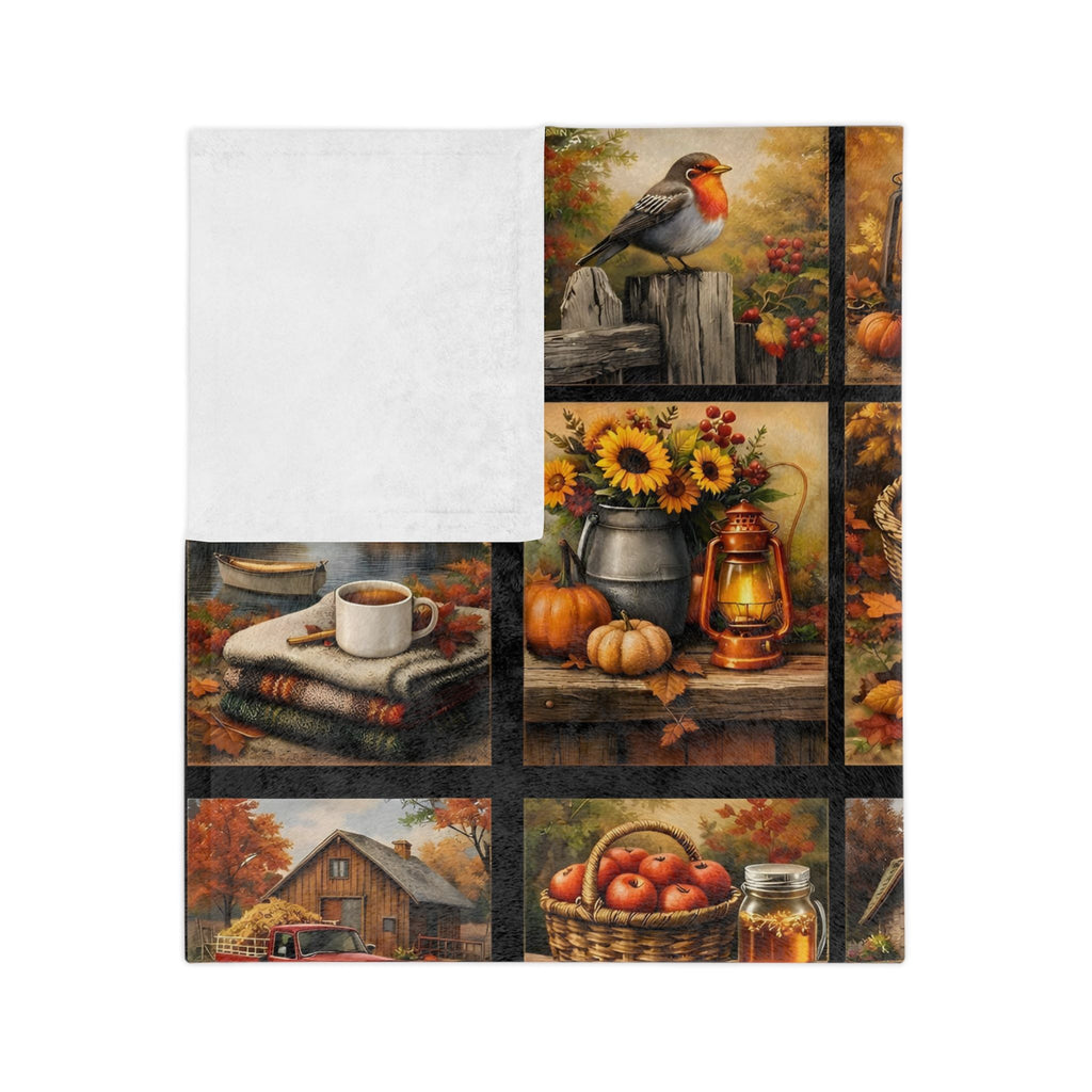 Fall Blanket with pumpkins, sunflowers, apples, cottages, and harvest scenes.
