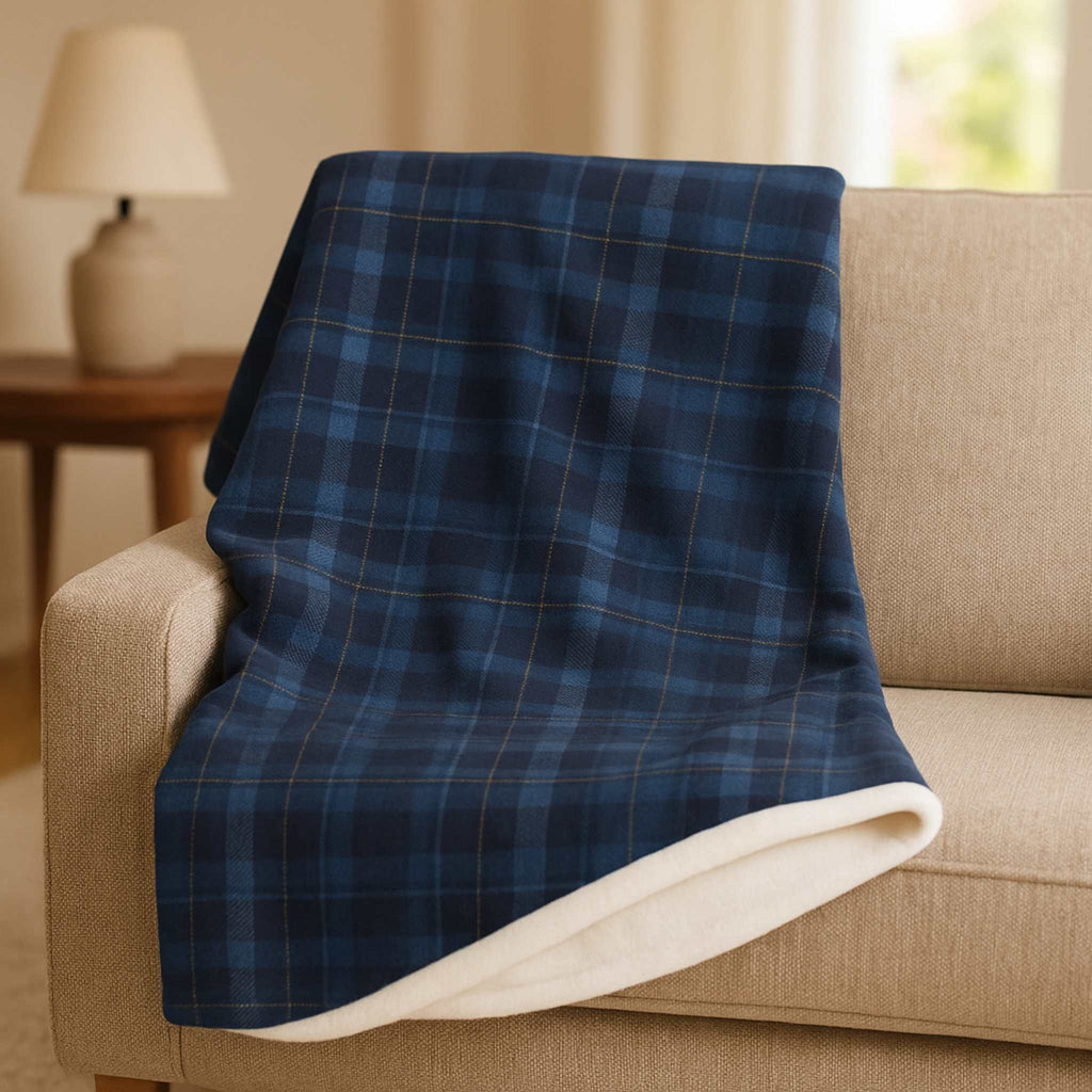 As dusk settles and the room fills with quiet calm, this plaid throw blanket becomes a trusted companion. The Frost Check design blends deep navy, charcoal, and muted gold colored lines for a pattern that feels both rugged and refined. Available in Standard Throw (50x60") and Oversized (60x80"), each piece comes in either sherpa with a fuzzy underside or velveteen with a plush white back. Order now to add timeless comfort and everyday warmth to your home.