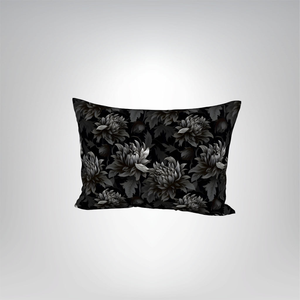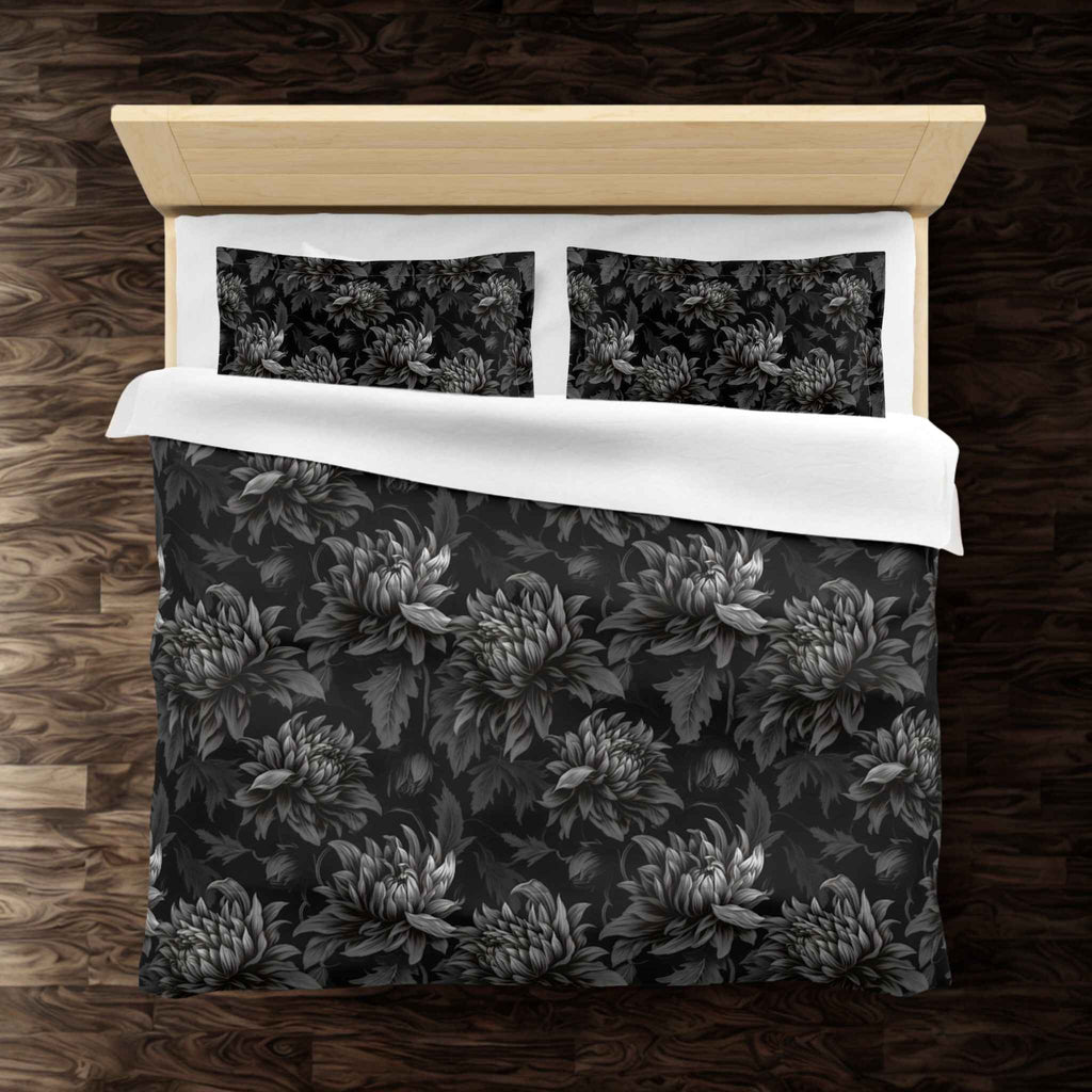 As twilight settles and shadows dance across the walls, the Midnight Black Dahlia duvet set transforms your bedroom into a sanctuary of moody refinement. This striking design layers dahlia-inspired blossoms and chrysanthemum-style petals in soft grayscale against a jet-black backdrop. Crafted from 100% cotton sateen, the fabric offers a breathable, silky-smooth feel with a subtle sheen. Perfect for cozy evenings and year-round comfort. Available in Queen or King with matching pillow shams, this gothic floral duvet set brings timeless artistry to your home. Order today to create a bedroom steeped in midnight beauty.