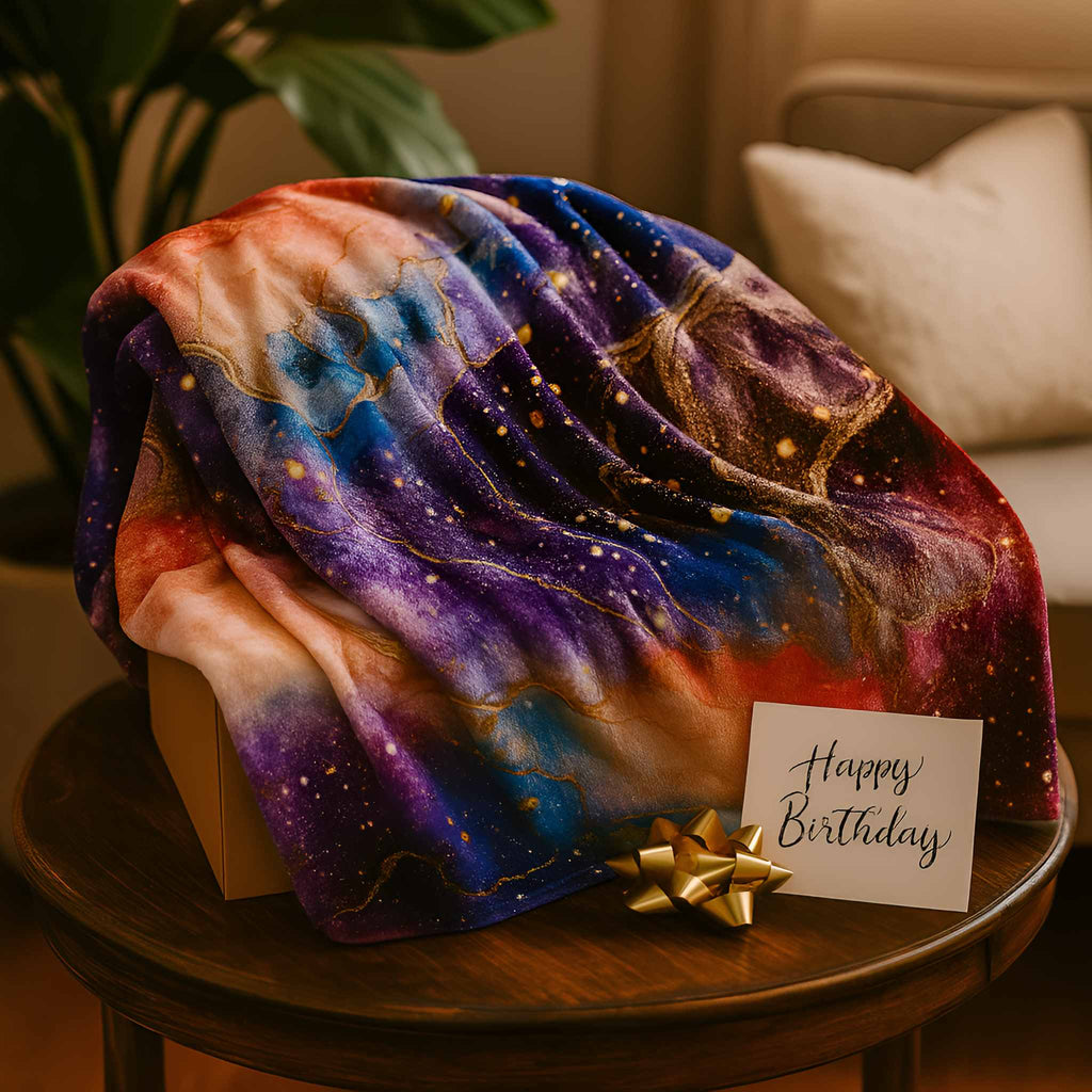 As night falls, this galaxy throw blanket invites you to drift into a universe of color and comfort. The Mystical Moonbeam design swirls violet, indigo, teal, and fiery orange together with shimmering golden constellations, creating the feeling of a starlit sky brought indoors. Available in Standard Throw (50x60") and Oversized (60x80"), each blanket is offered in either sherpa with a fuzzy underside or velveteen with a smooth plush back. Order now to bring celestial warmth and story-rich design into your home.