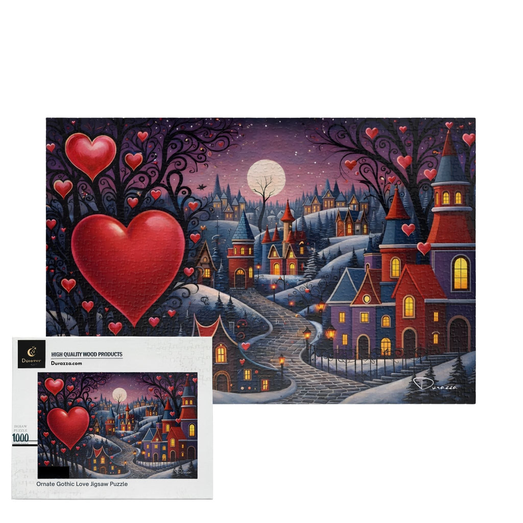 A romantic gothic village jigsaw puzzle filled with heart-lit details that create a cozy yet dramatic scene on your table.